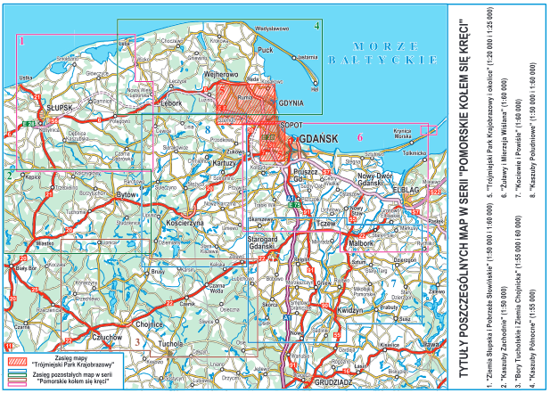 Jedna z ośmiu map w serii: "Pomorskie kołem się kręci". Na mapach umieszczono szlaki rowerowe, turystyki pieszej PTTK, Sopockie Szlaki Spacerowe, Nordic Walking, konne oraz kajakowe.