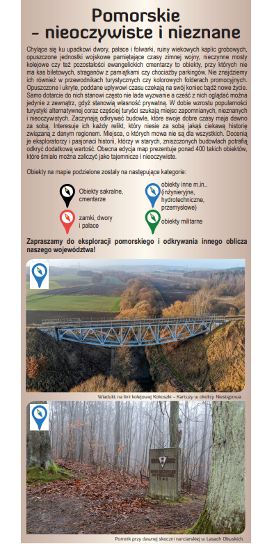 Najnowsze wydanie mapy zostało uzupełnione o obiekty mniej znane, będące nieoczywistą, alternatywną propozycją eksploracji regionu i odkrywania innego oblicza naszego województwa. Na mapie zaznaczono opuszczone dwory, pałace i budynki gospodarcze, ruiny kaplic i obiektów sakralnych, zapomniane cmentarze, nieczynne jednostki wojskowe, dawne schrony i fortyfikacje, a także zabytki techniki.