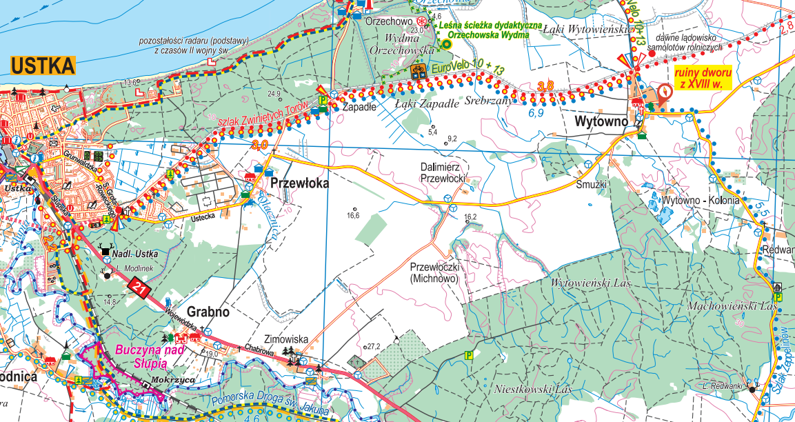 Mapa obejmuje swym zasięgiem obszar powiatów słupskiego i lęborskiego. Dzięki niej turysta można odnaleźć wraki statków, dawne lasy zasypane przez ruchome wydmy czy też krzyżackie kamienie graniczne. Pod mapami umieszczono opis Słowińskiego Parku Narodowego, Papieskiego Szlaku Kajakowego oraz Krainy w Kratę. W nowej edycji dodano lokalizację obiektów takich jak opuszczony pałac w Krzywaniu, czy stara gorzelnia w Jasieniu.