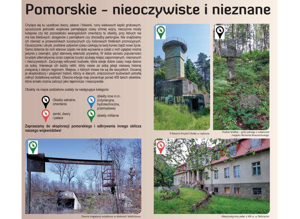 Najnowsze wydanie mapy zostało uzupełnione o obiekty mniej znane, będące nieoczywistą, alternatywną propozycją eksploracji regionu i odkrywania innego oblicza naszego województwa. Na mapie zaznaczono opuszczone dwory, pałace i budynki gospodarcze, ruiny kaplic i obiektów sakralnych, zapomniane cmentarze, nieczynne jednostki wojskowe, dawne schrony i fortyfikacje, a także zabytki techniki.
