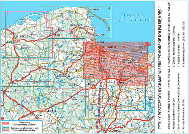 Jedna z ośmiu map w serii: "Pomorskie kołem się kręci". Na mapach umieszczono szlaki rowerowe, turystyki pieszej PTTK, Sopockie Szlaki Spacerowe, Nordic Walking, konne oraz kajakowe.