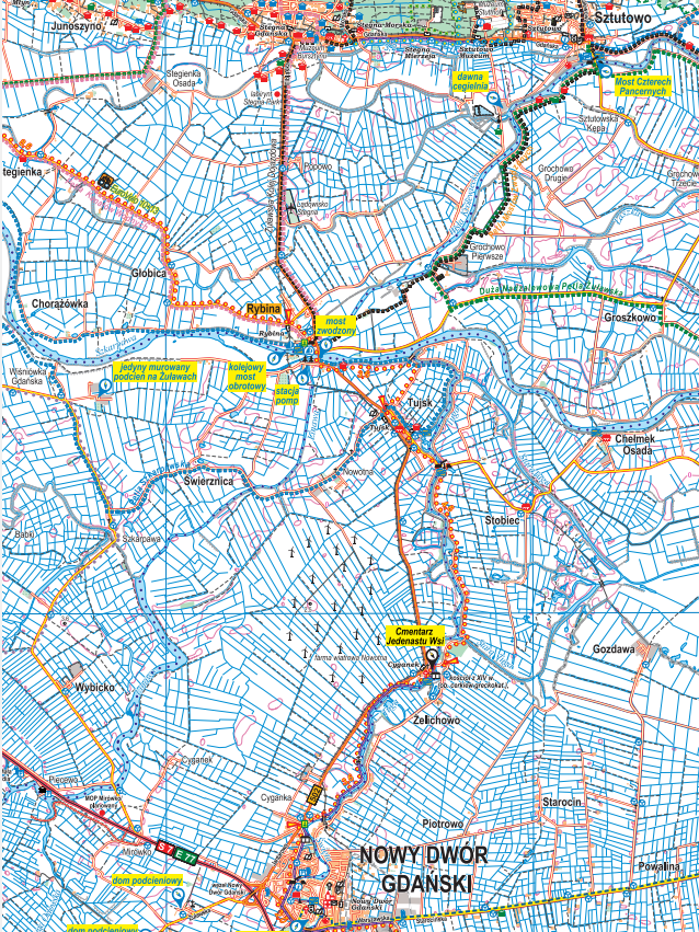 Mapa obejmuje swym zasięgiem obszar powiatów gdańskiego i nowodworskiego. Niespodzianką dla większości będzie to, że mierzeja wiślana zaczyna się w Sopocie. Tak więc mapa obejmuje również fragment Trójmiasta oraz obszar na południe od niego. W trakcie wycieczki możemy poszukać pamiątek po Mennonitach, obejrzeć domy podcieniowe, zmierzyć ile jesteśmy pod poziomem morza (w końcu to obszar depresyjny) ale również skorzystać z infrastruktury Pętli Żuławskiej - drogi wodnej o długości ponad 300 km.
