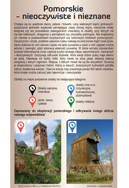 Najnowsze wydanie mapy zostało uzupełnione o obiekty mniej znane, będące nieoczywistą, alternatywną propozycją eksploracji regionu i odkrywania innego oblicza naszego województwa. Na mapie zaznaczono opuszczone dwory, pałace i budynki gospodarcze, ruiny kaplic i obiektów sakralnych, zapomniane cmentarze, nieczynne jednostki wojskowe, dawne schrony i fortyfikacje, a także zabytki techniki.