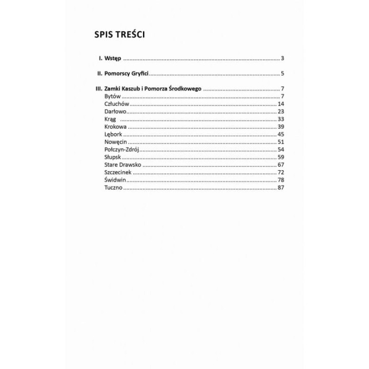 Vademecum prezentujące dzieje 13 zamków na Kaszubach i Pomorzu Środkowym (Bytów, Człuchów, Darłowo, Drahim, Krąg, Krokowa, Lębork, Nowęcin, Połczyn, Słupsk, Szczecinek, Świdwin i Tuczno). Przewodnik zawiera mapy, plany, barwne fotografie, anegdoty i informacje niezastąpione przy poznawaniu tych intrygujących budowli.